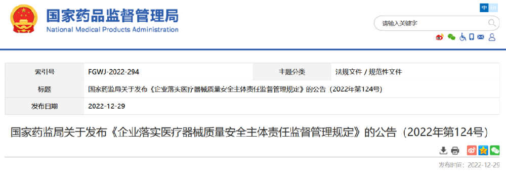 2023-02-102022年12月29日,國家藥品監(jiān)督管理局發(fā)布《企業(yè)落實醫(yī)療器械質量安全主體責任...